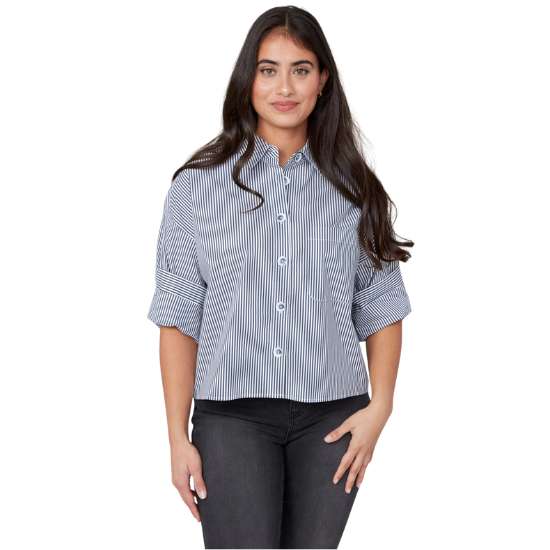 This blouse from Renuar is the perfect combo of oversized buttons, stripes, and fold up sleeves. Pair with a white pair of jeans, dark jeans, or shorts.