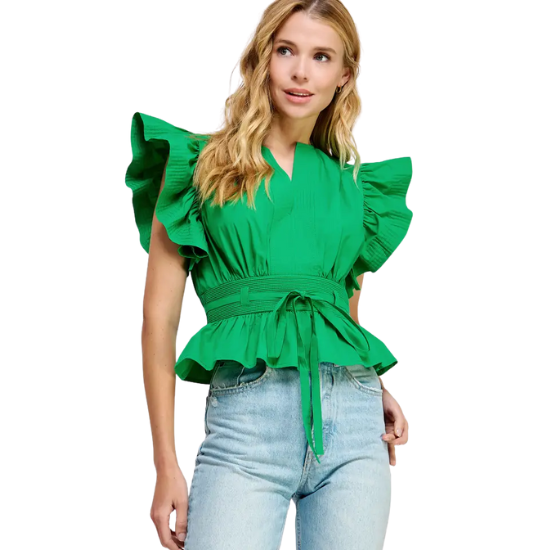 Flutter sleeve peplum top in cotton poplin fabric. This blouse features short fluttered ruffle sleeves with top stitch detail, a split V-neck line, side zipper closure, pintuck detail at shoulder, cinched banded waist with stretch smock at back, and a removeable waist tie.