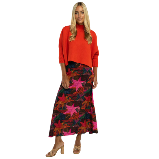 The Tiffany Skirt brings bold sophistication to any look. Featuring a striking star print in vibrant shades of pink, orange, and green, this midi-length skirt offers a flattering, flowy silhouette with a comfortable waistband. Pair it with the matching Isla Blouse for a coordinated statement or style it with a simple top for an effortlessly chic ensemble.